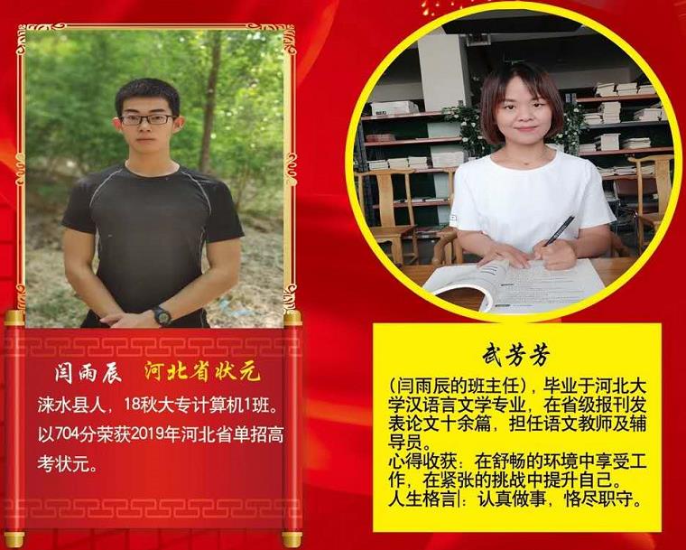 2019年在河北省春季高考中我校大专部共计586人参加考试,在满分750分的情况下,计算机1班闫雨辰同学,以总分704分获得河北省春季高考状元;计算机3班李若寒同学获得河北省春季高考十类第10名的好成绩;幼教1班李若茜同学获得河北省春季高考六类第7名的好成绩。本次考试中700分以上1人,600分以上